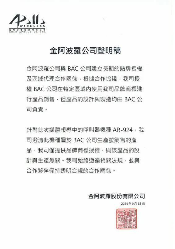 在9月17日發(fā)生在黎巴嫩貝魯特等地區(qū)的的“奪命尋呼機”恐怖襲擊事件,該事件共造成39人死亡,約3000人受傷。而造成恐怖襲擊的尋呼機經(jīng)過黎巴嫩調(diào)查,確定為臺灣金阿波羅公司的AR924型尋呼機,以及該公司生產(chǎn)的一些其它機型。