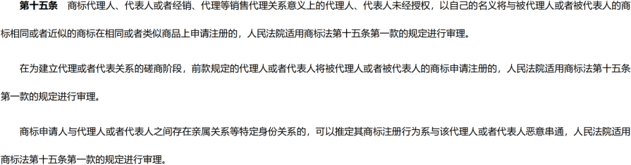 最后,關(guān)于《商標(biāo)法》第15條第1款所要求的“代理、代表”關(guān)系的認(rèn)定,目前商標(biāo)審查實踐和司法實踐均作了相對廣義的理解,除了民法意義上的代理人、代表人、商標(biāo)代理人外,《最高人民法院關(guān)于審理商標(biāo)授權(quán)確權(quán)行政案件若干問題的規(guī)定》第十五條還規(guī)定了經(jīng)銷、代理等銷售代理關(guān)系、建立代理或者代表關(guān)系的磋商階段、串通合謀關(guān)系等三種情形。其中,對于經(jīng)銷、代理等銷售代理關(guān)系,應(yīng)依據(jù)雙方簽訂的合同及實際經(jīng)營情況進行綜合判斷;對于代理、代表關(guān)系磋商階段,應(yīng)關(guān)注雙方是否存在實際的代理行為及意圖;對于串通合謀關(guān)系,可以基于商標(biāo)申請人與代理人或代表人的特定關(guān)系進行推定,如是否存在利益輸送、共同謀劃等行為。